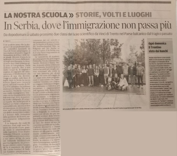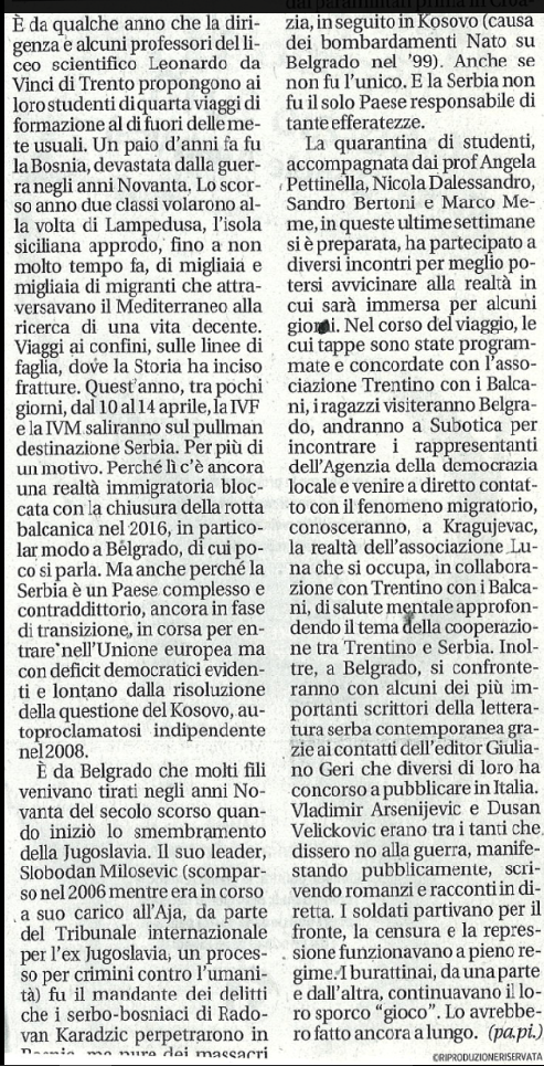 L’incontro formativo è stato l’ultima tappa di avvicinamento alla Serbia che precede il viaggio vero e proprio in Serbia che avrà luogo durante i giorni 11-14 aprile e che porterà i 40 studenti a scoprire il passato recente e il presente di un paese, la Serbia, un paese con un passato difficile e che non senza difficoltà ha intrapreso la strada dell’avvicinamento all’Unione Europea e che è tornato recentemente alle cronache per essere territorio di passaggio della Rotta Balcanica. Pubblichiamo l’articolo di Paolo Piffer apparso domenica 8 aprile sul Trentino.